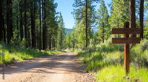 serene forest road surrounded by tall pine trees and lush greenery, inviting exploration and adventure in nature beauty
