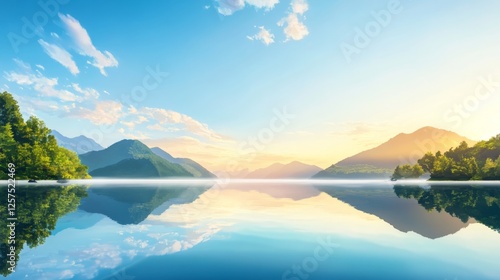 Serene lake reflecting majestic mountains at sunrise a peaceful landscape panorama ideal for travel and nature projects