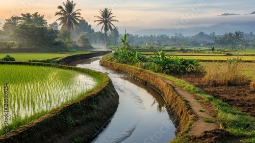 Serene Landscape with Curved Stream and Vibrant Rice Fields at Dawn