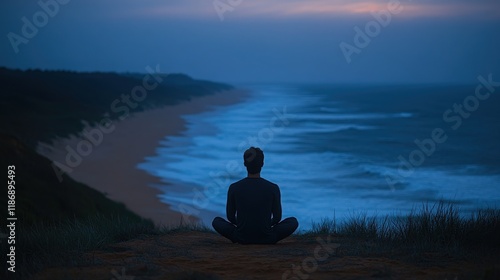 Serene Meditation by the Ocean: A Person Sitting Cross-Legged at Dusk with Waves Crashing on the Shoreline in a Tranquil Natural Landscape