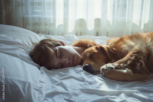 Serene Moment of a Young Man and His Dog Sleeping Together in a Sunlit White Bedroom