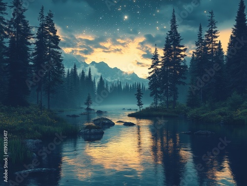Serene mountain lake at sunset with starry night sky, reflecting golden light on tranquil waters, surrounded by lush forest