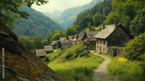 Serene Mountain Village nestled in lush greenery, picturesque landscape of tranquil valley homes, scenic pathway winding through the idyllic countryside