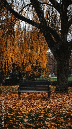 Serene Park Bench Under Golden Willow Tree in Fall Season