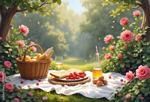 Serene Picnic Scene in a Blooming Garden, Celebrating International Women’s Day 8 March