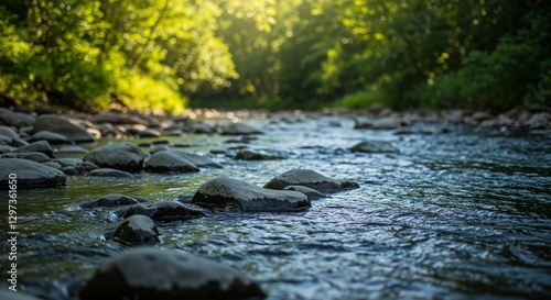 Serene river flowing over smooth stones amidst lush greenery and warm sunlight filtering through trees