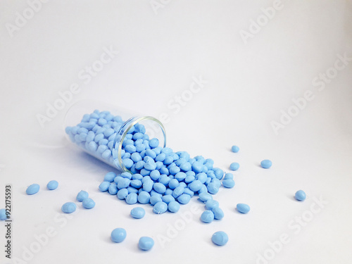 Serene sky blue masterbatch granules on white background. Color pigment carrier polymer in plastic industry