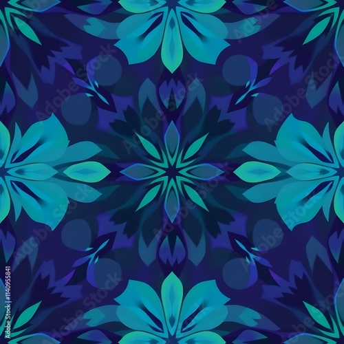 Serene Teal Mandala: Abstract seamless pattern in shades of teal, blue, and purple, featuring a captivating mandala design with intricate floral details. Perfect for textile prints, wallpapers.