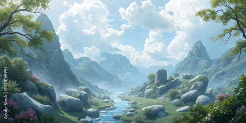 Serene Valley Landscape A Picturesque River Flows Through Misty Mountains, Adorned with Ancient Stone Steps and Lush Vegetation