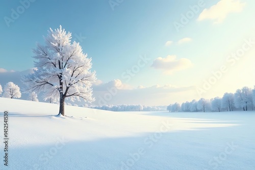Serene Winter Landscape A Solitary Frost-Covered Tree in a Snow-Dusted Field Under a Pale Sky