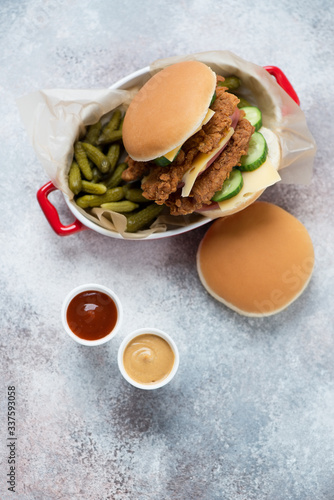 Serving tray with chicken strips burger, pickles and dips on a beige stone background, top view with space, vertical shot