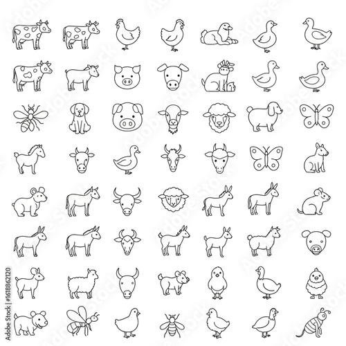 Set of 64 Farm Animals and Insects Outline Vector Icons