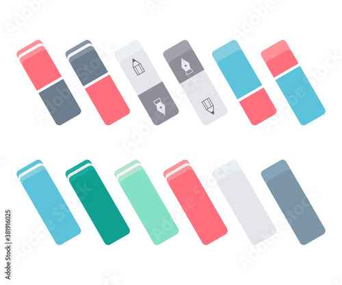 Set of colorful ink and graphite erasers. Flat vector illustration isolated on white background