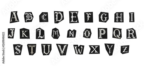 set of cut-out english png alphabet from magazines on a white background, black and white gothic ransom style