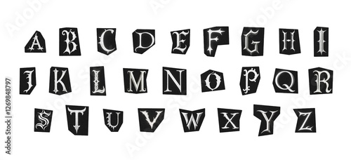 set of cut-out english png alphabet from magazines on a white background, black and white gothic ransom style