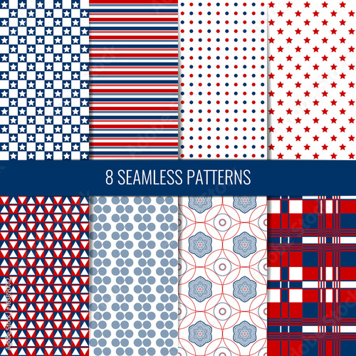 Set of eight simple seamless patterns. Red, blue and white colors.