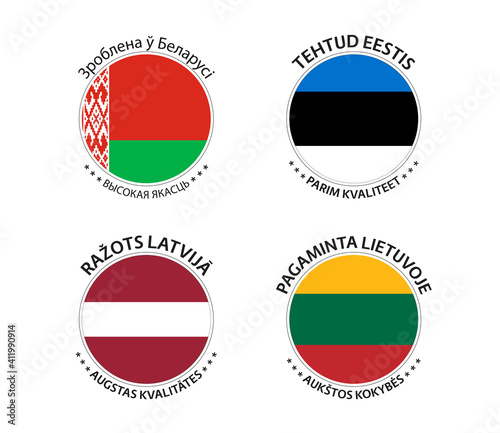 Set of four Belarussian, Estonian, Latvian and Lithuanian stickers. Made in Belarus, Made in Estonia, Made in Latvia and Made in Lithuania. Simple icons with flags isolated on a white background