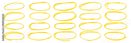 Set of hand drawn yellow round circle, yellow highlighter vector design isolated on white background