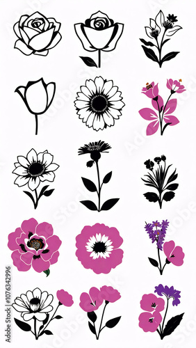 Set of logotype icons flowers Rose, Tulip, Orchid, Sunflower, Lily, Daisy, Daffodil, Jasmine, Lavender, Marigold, Peony, Chrysanthemum, Hibiscus, Poppy, Violet illustration silhouettes