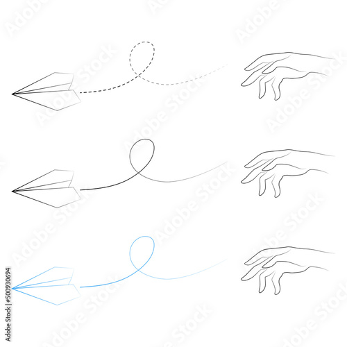 Set of vector illustrations of hand throwing paper plane icons. Outline simple craft paper airplane isolated on white background. Icon symbol of travel and route.