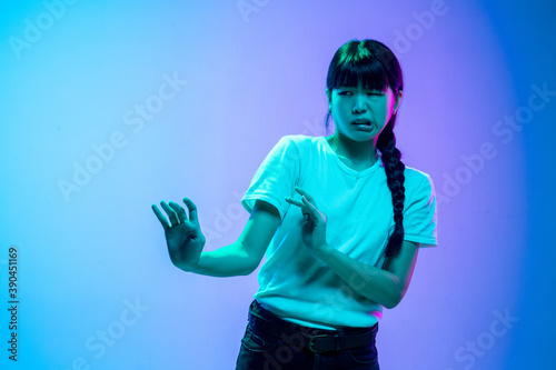Shocked, scared. Young asian woman's portrait on gradient blue-purple studio background in neon light. Concept of youth, human emotions, facial expression, sales, ad. Beautiful brunette model.