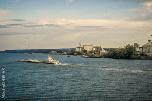 Shoreline Industry and Buildings and Tug Boat Pushing Sand Barges Down a River