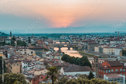 Shot of Ponte Vecchio, Florence, Firenze, Tuscany, Italy at golden hour sunset