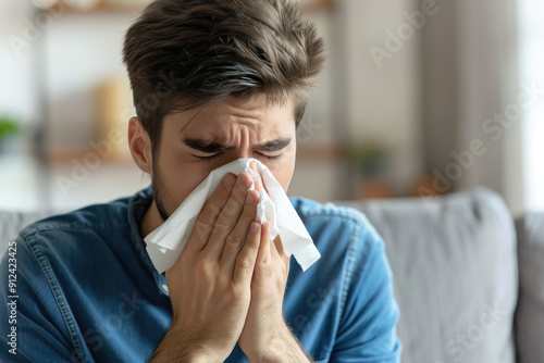 Sick young man blowing his nose on a tissue at home