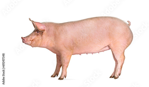 domestic pig, pig, hoofed, omnivore, cattle, mammal, farm animal, farm, farm animal, domestic, vertebrate, animal, studio, studio shot, nobody, no people, white background, cut-out, isolated on white, isolated, white, one animal, pink, standing, profile, half face, baby pig