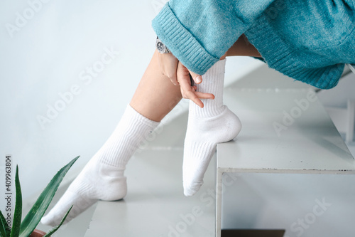 Side view of anonymous female in white socks and warm sweater sitting on stairs in bright house