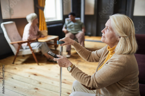 Side view portrait of Caucasian senior woman holding remote while watching TV in nursing home, copy space