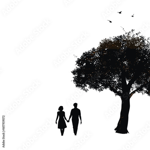 Silhouette of a couple walking hand in hand under a tree.