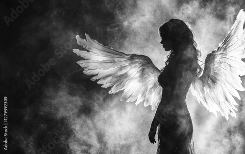 Silhouette of a figure with angel wings amidst a smoky backdrop in black and white