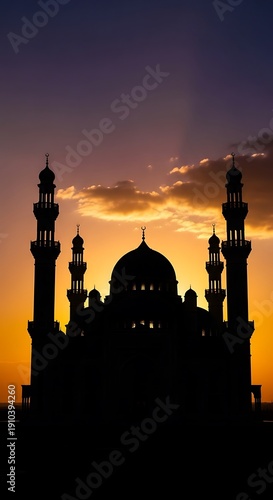 Silhouette of a mosque at sunset.