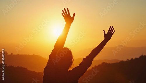 Silhouette of a woman greeting the sunset, arms raised in celebration, serene mountain landscape