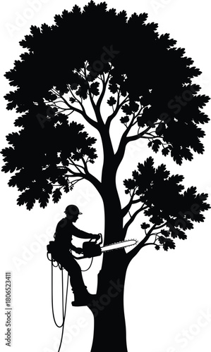 Silhouette of arborist using chainsaw from lift platform while trimming tree branches in black and white
