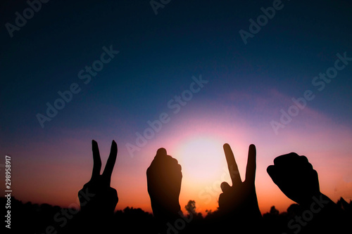Silhouette of hands gesture V (victory) sign and fist power for victory or peace at sunset. Concept: success and winner in 2020.