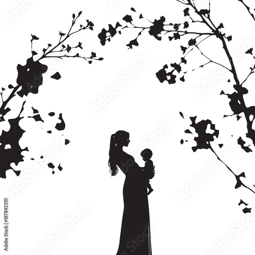Silhouette of loving mother holding baby under blooming tree branches
