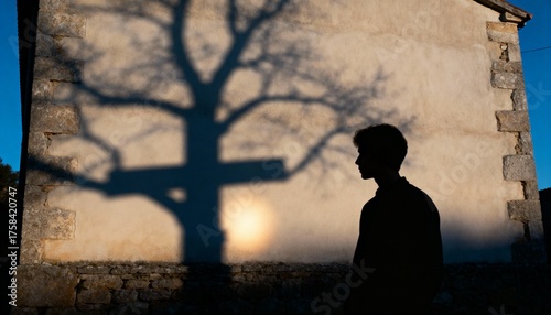 Silhouette of person with tree shadow on rustic stone wall at sunset