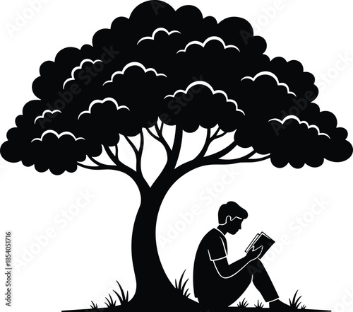 Silhouette person reading under tree, peaceful nature scene, learning concept, quiet moment illustration, flat vector