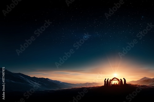 Silhouetted figures form a circle under a starry sky with a warm sunrise, symbolizing unity, hope, and connection against a vast desert landscape.
