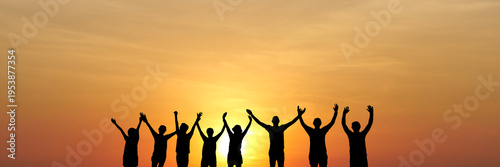 Silhouetted figures with arms raised, bathed in warm sunset hues, representing unity