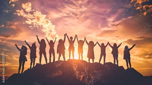 Silhouetted Group of People Celebrating at Sunset