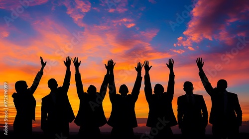 Silhouettes of Business People Raising Their Hands Against a Dramatic Sunset Sky