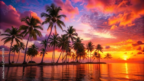 Silhouettes of palm trees stand tall against a backdrop of fiery orange and purple sunset hues, reflecting in the calm waters of the ocean.