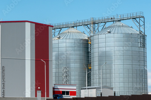 silver silos on agro manufacturing plant for processing drying cleaning and storage of agricultural products, flour, cereals and grain. Large iron barrels of grain. Granary elevator