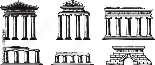 Six distinct classical columns stand in a row showcasing architectural .