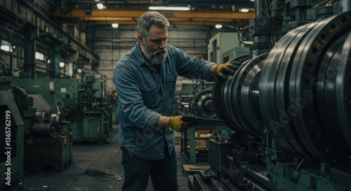 Skilled worker operating machinery in a busy industrial workshop, with tools and equipment in the background