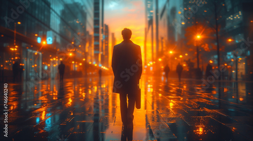 Skyscraper Sunset Solitude Rear View Silhouette of a Businessman in the Financial District.