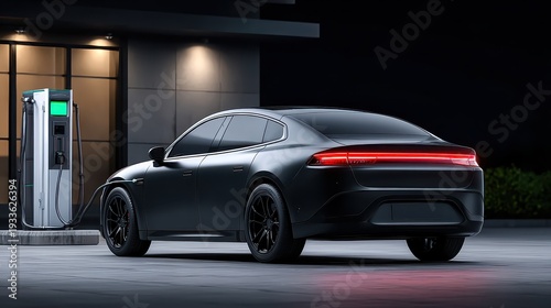 Sleek Electric Vehicle Charging at Modern Station During Nighttime with Ambient Lighting and Urban Vibes